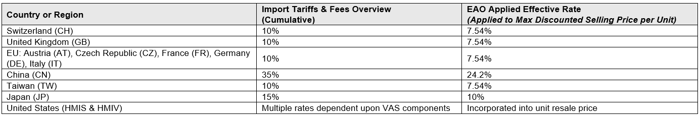 EAO Corporation (EAO North America) actively seeks to mitigate the impact of tariffs by applying a lower percentage margin based on the highest discounted selling price which typically corresponds to the maximum quantity discount level. This approach aligns with the actual cost rate, allowing EAO Corporation (EAO North America) to present competitive pricing without revealing the precise cost of goods sold (COGS). By doing so, EAO Corporation (EAO North America) maintains the confidentiality of its product cost structures, safeguarding proprietary supplier agreements and internal pricing strategies, while still offering transparency to the customer. Please note that tariff details, including rates, covered goods, and country‑of‑origin requirements, are subject to change at any time without prior notice due to evolving regulatory and operational conditions. Final tariff determinations are based on the rules and requirements in effect at the time the products are collected by Customs and Border Protection.